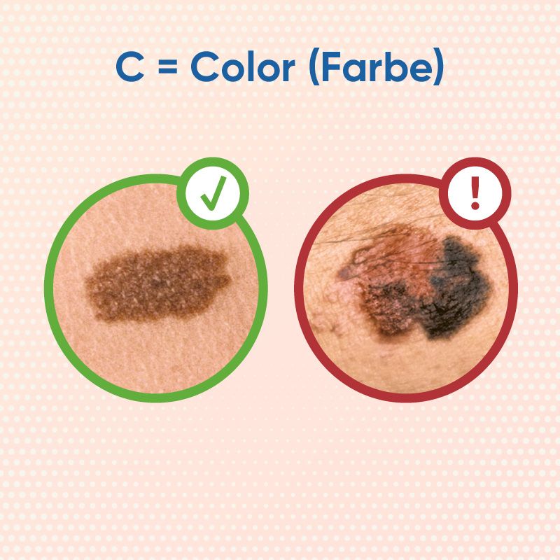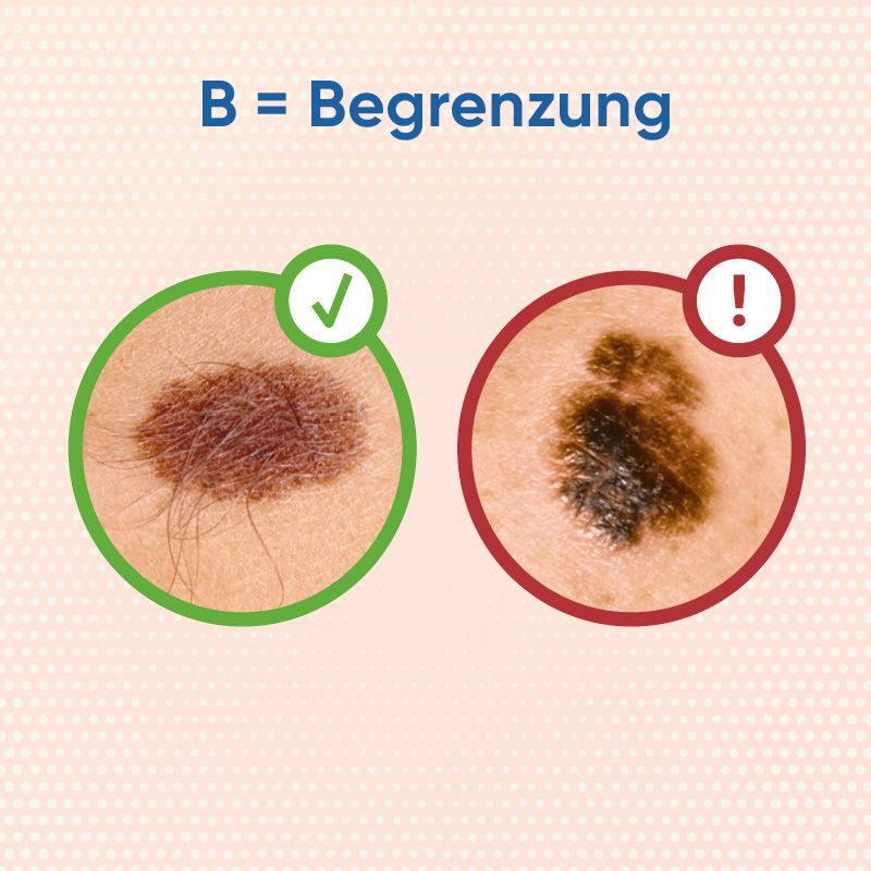 A = Asymmetrie: asymmetrisches Wachstum, nicht rund oder oval. B = Begrenzung: ungleichmäßig, unscharf, fließender Wechsel zum Normalgewebe. C = Color (Farbe): ungleich starke Pigmentierung oder Mehrfarbigkeit. D = Durchmesser: schnelles Wachstum, oftmals vergrößerter Durchmesser (5 mm oder größer).